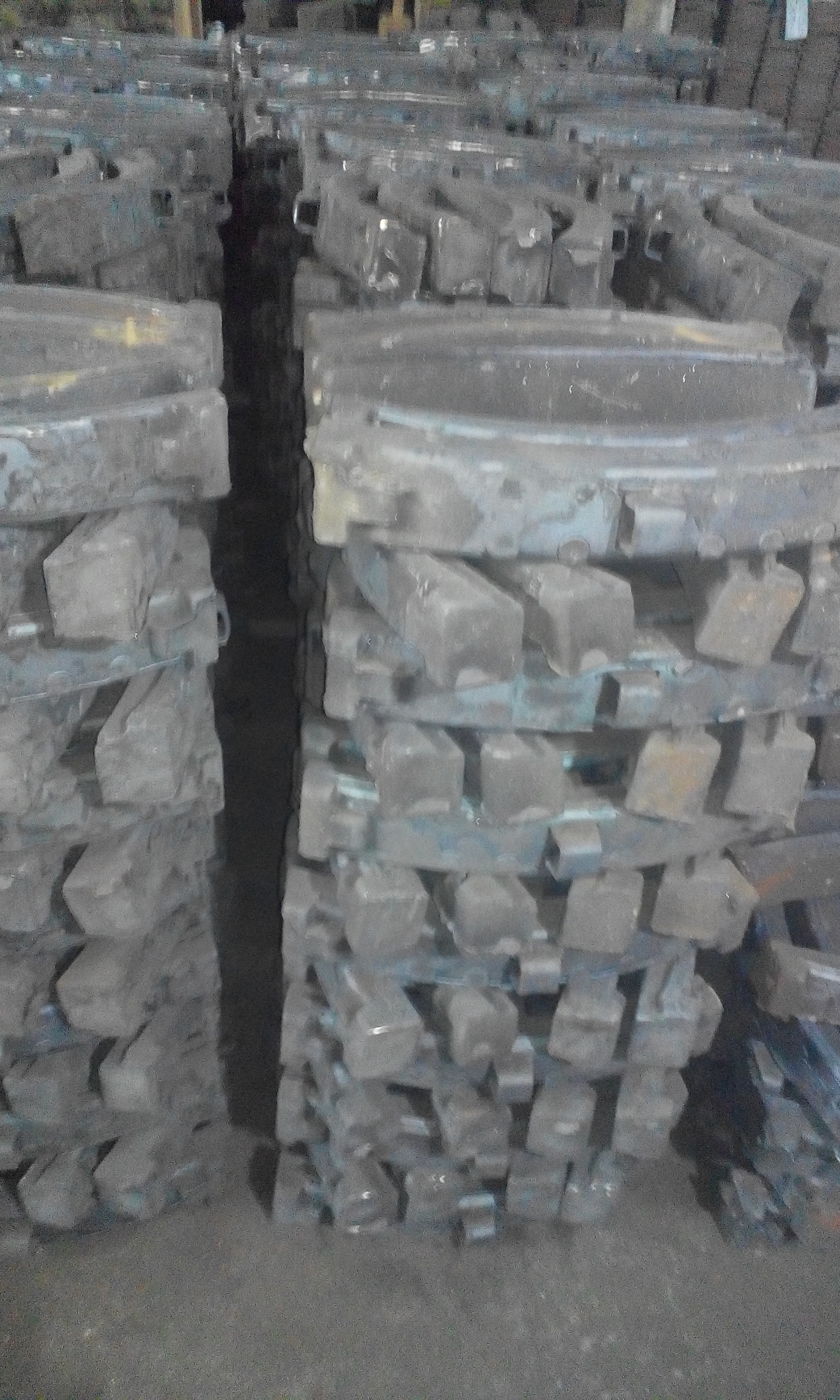 DetailsWide variety of railway components including friction wedges, end pieces, strut castings, and bogie parts.